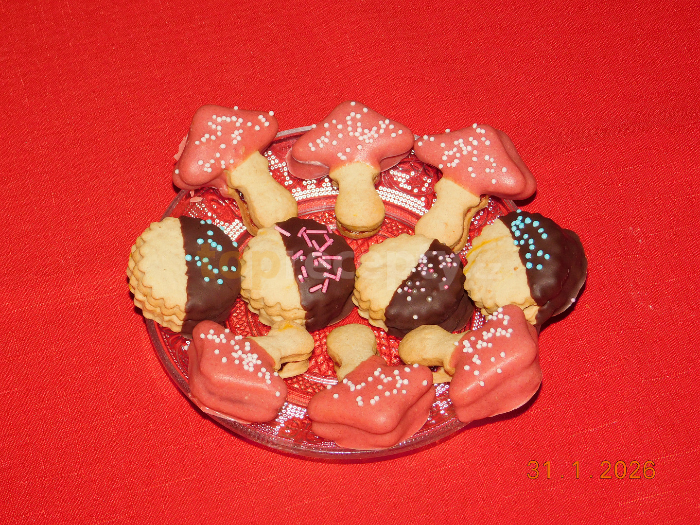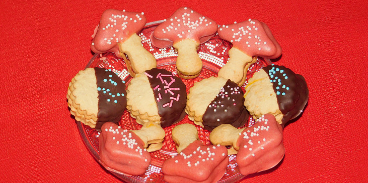 mouka hladká, pudink jahodový, cukr, tuk hera, vejce, kypřící prášek do pečiva, rum, marmeláda, poleva čokoládová, zdobení
