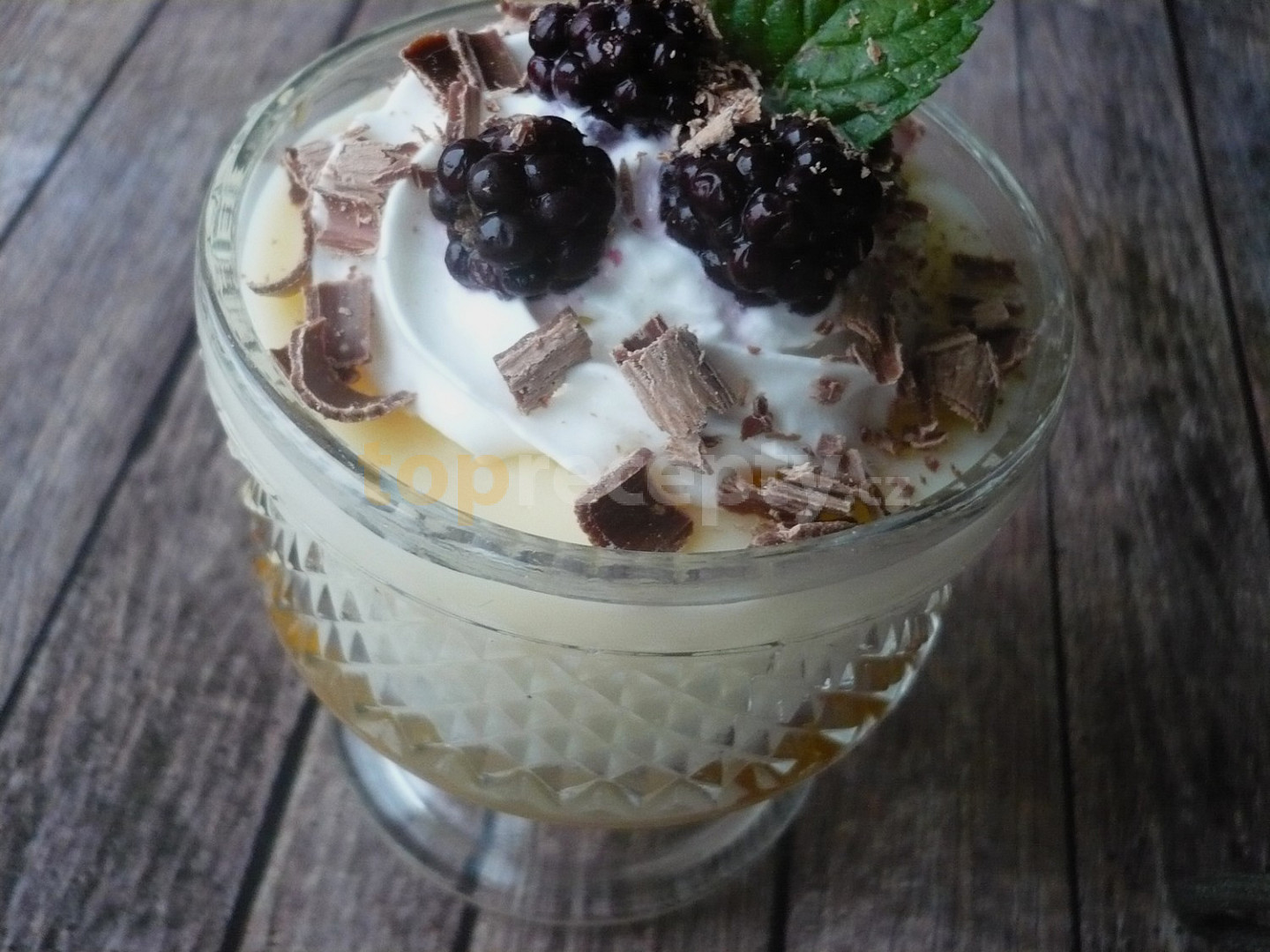 pudinkový prášek, mléko, cukr, piškoty, ovoce kompotované, koňak vaječný, šlehačka, zdobení čokoládové
