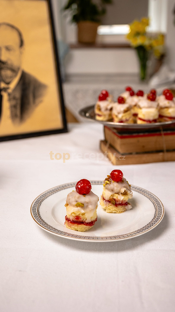 cukr moučkový, vejce, likér, mouka, máslo, mouka hrubá, marmeláda malinová, korpus, ořechy, cukr, rum, cukr, voda, rum, šťáva citronová, třešně, ořechy pistáciové nesolené