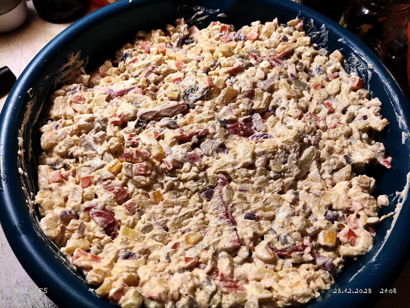 brambory, cibule červená, mrkev, petržel, bulva celerová, okurky sterilované, vejce, fazole bílé, hrášek mražený, žampiony sterilované, kapie sterilovaná, kukuřice ve slaném nálevu, majonéza, smetana zakysaná, lák z okurek, hořčice plnotučná, sůl, pepř mletý