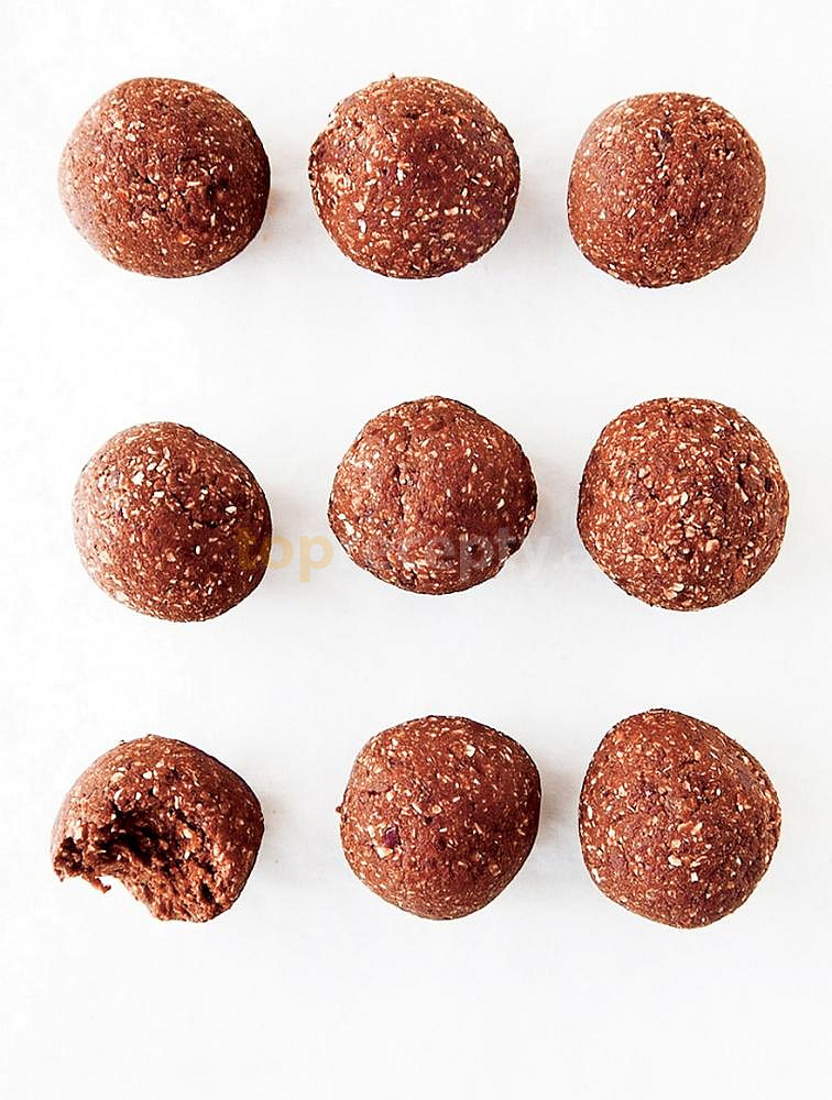 vločky ovesné, datle, olej kokosový, ořechy vlašské, kakao holandské, extrakt vanilkový, kokos strouhaný, oříšky, kakao, karob, semínka lněná, semínka sezamová, semínka lněná