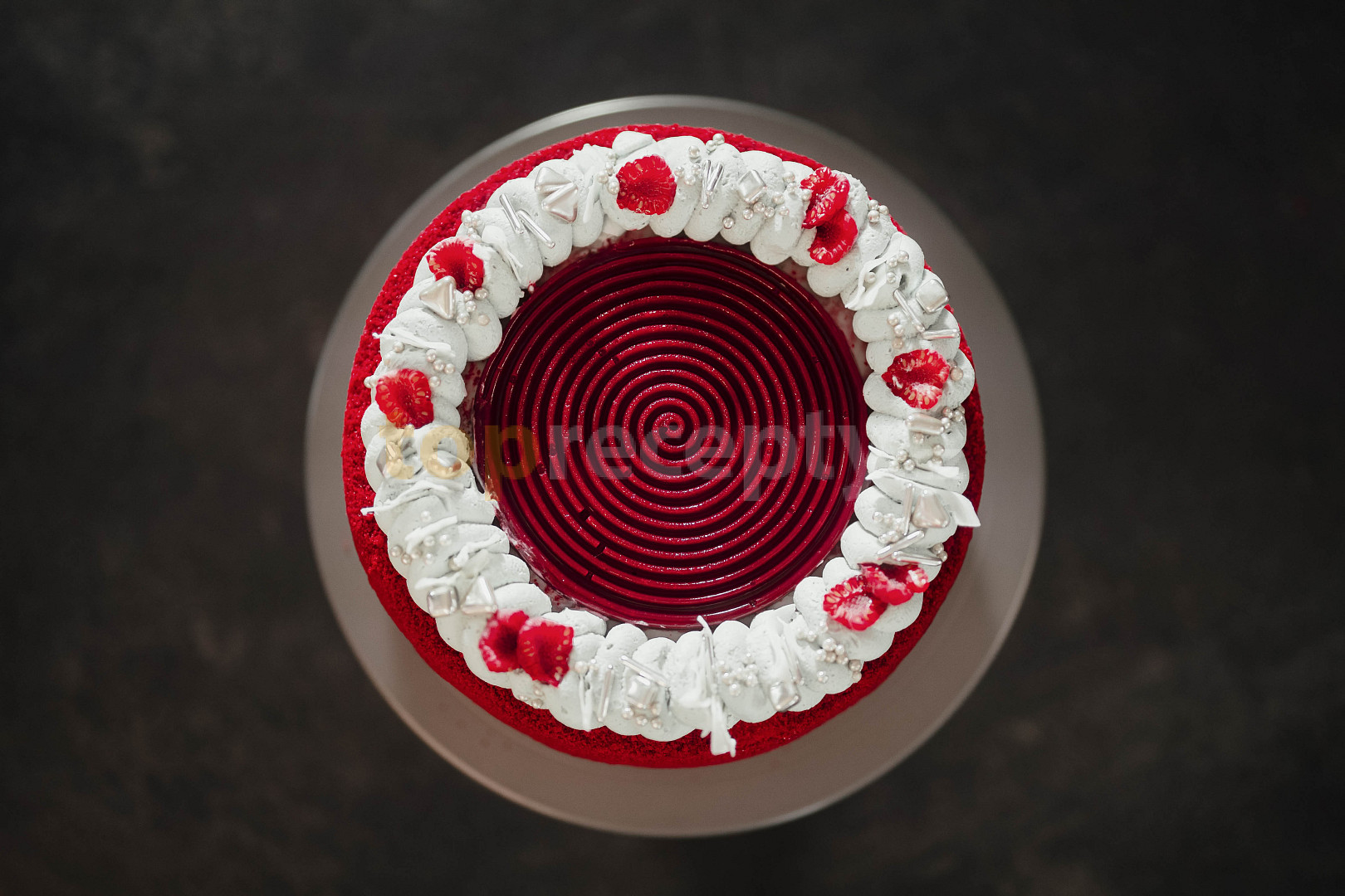 red velvet, red velvet, cukr, smetana ke šlehání, mascarpone, cukr moučkový, potravinářské barvivo černé, sůl, maliny, kokos, zdobení cukrářské