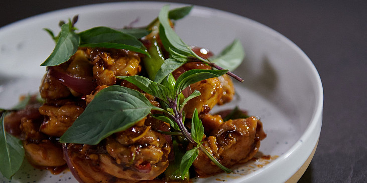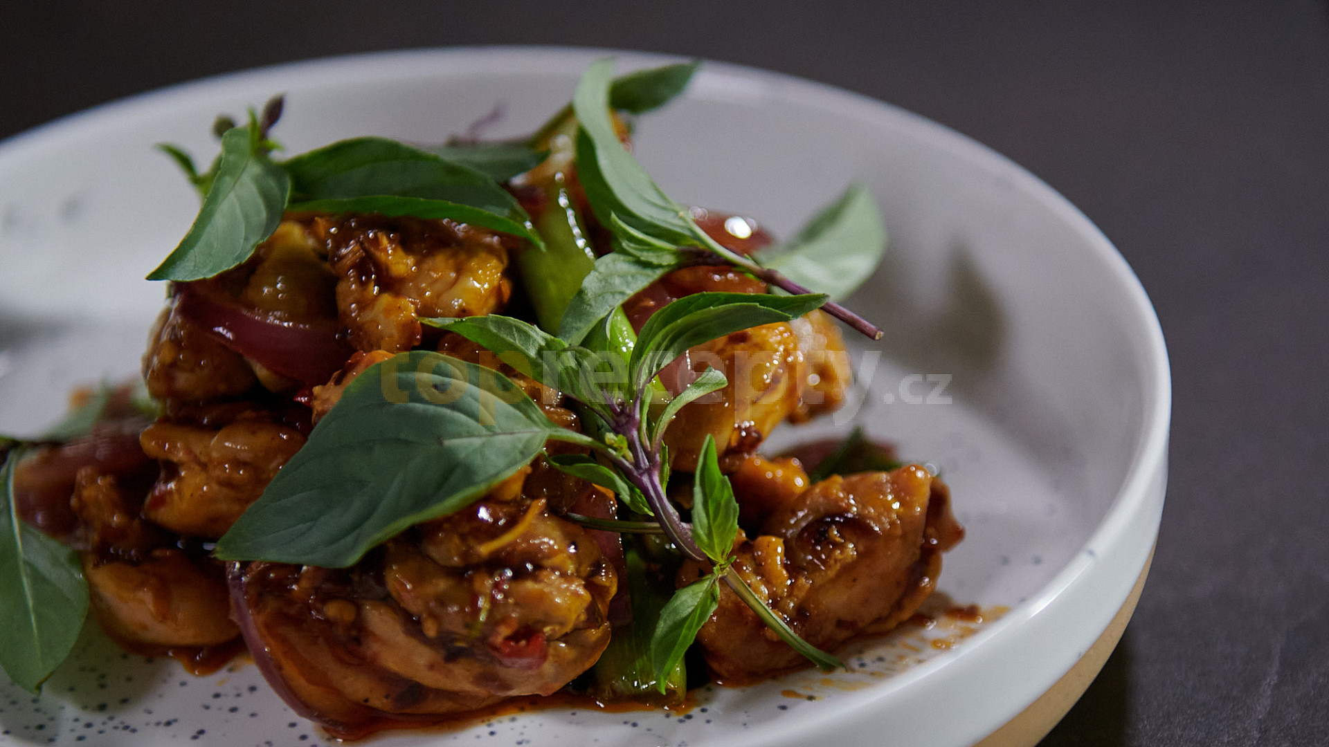 kuře, sůl, cukr krupice, kurkuma, pepř mletý, olej, cibule šalotka, tráva citronová, cibulka jarní, sádlo, ústřicová omáčka, cibule fialová, bazalka čerstvá