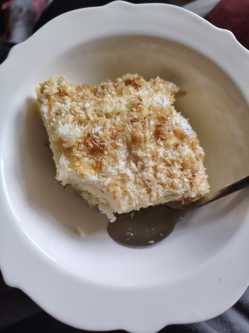 vejce, cukr moučkový, mléko, mouka polohrubá, olej, kypřící prášek do pečiva, tuk, mouka hrubá, kokos, cukr moučkový, smetana ke šlehání