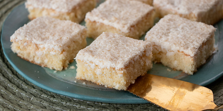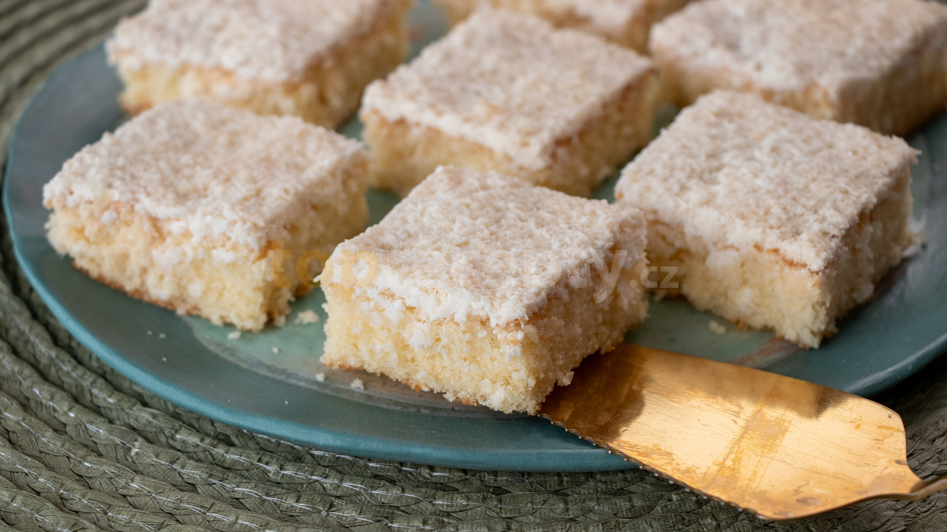 vejce, cukr moučkový, mléko, mouka polohrubá, olej, kypřící prášek do pečiva, tuk, mouka hrubá, kokos, cukr moučkový, smetana ke šlehání