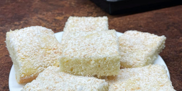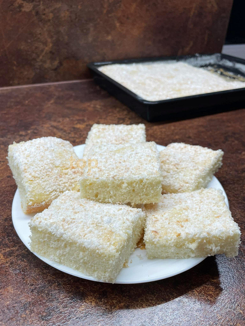 cukr moučkový, vejce, mléko, mouka polohrubá, olej, kypřící prášek do pečiva, kokos strouhaný, cukr moučkový, smetana ke šlehání, mouka hrubá, máslo