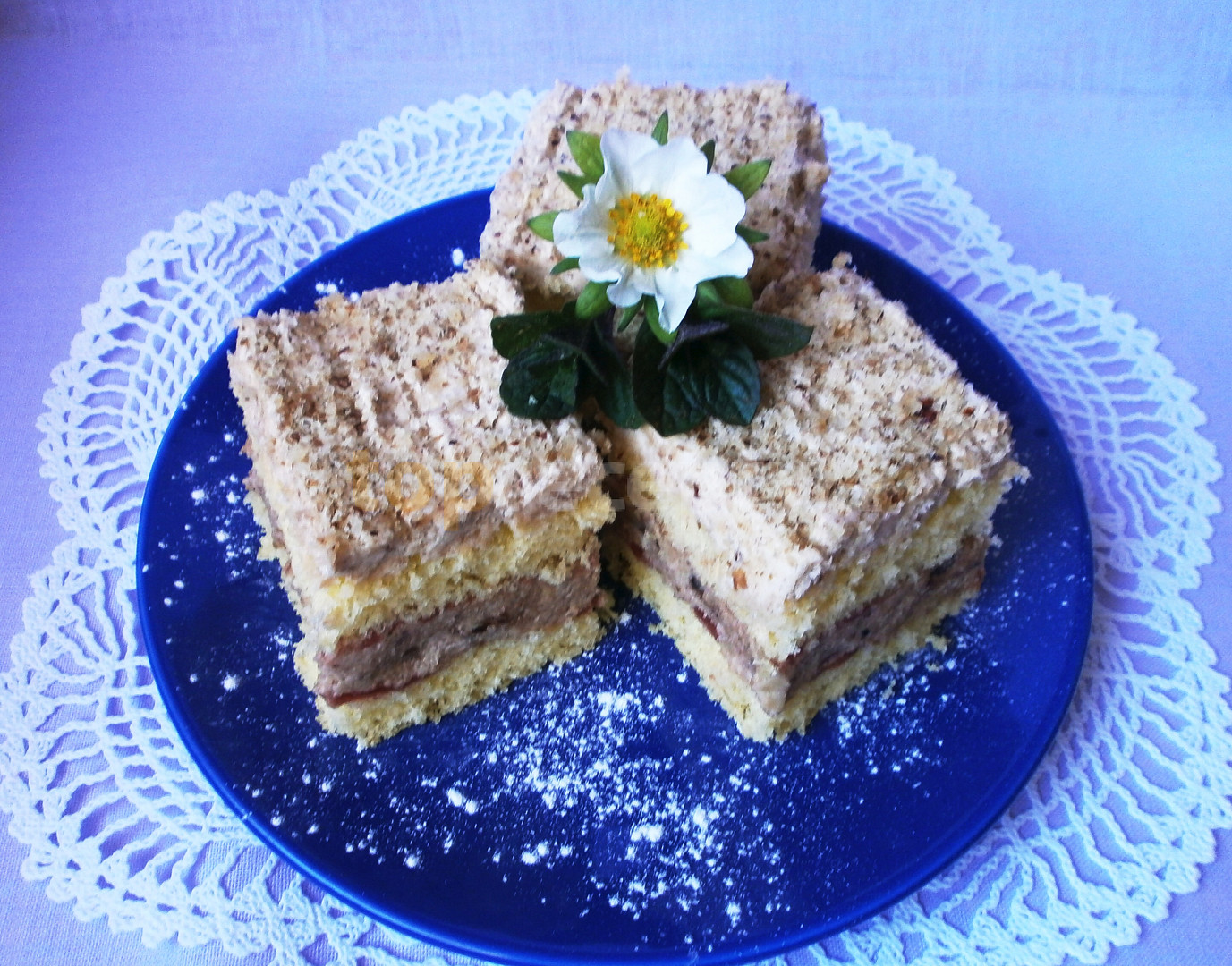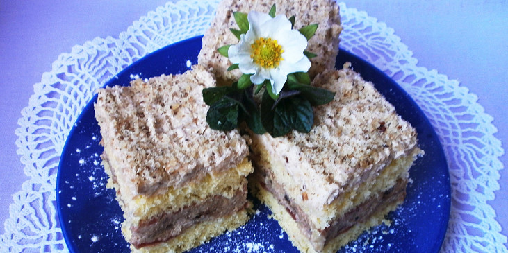 pudink vanilkový, mléko, mouka polohrubá, cukr vanilkový, máslo, cukr moučkový, ořechy vlašské, piškoty, mléko, rum, vejce, cukr krystal, mouka polohrubá, voda, kypřící prášek do pečiva, marmeláda, ořechy vlašské