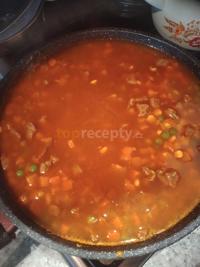 plec vepřová, rýže, směs zeleninová mražená, cibule, česnek, sůl, pepř mletý, paprika sušená sladká, olej, voda, sýr tvrdý