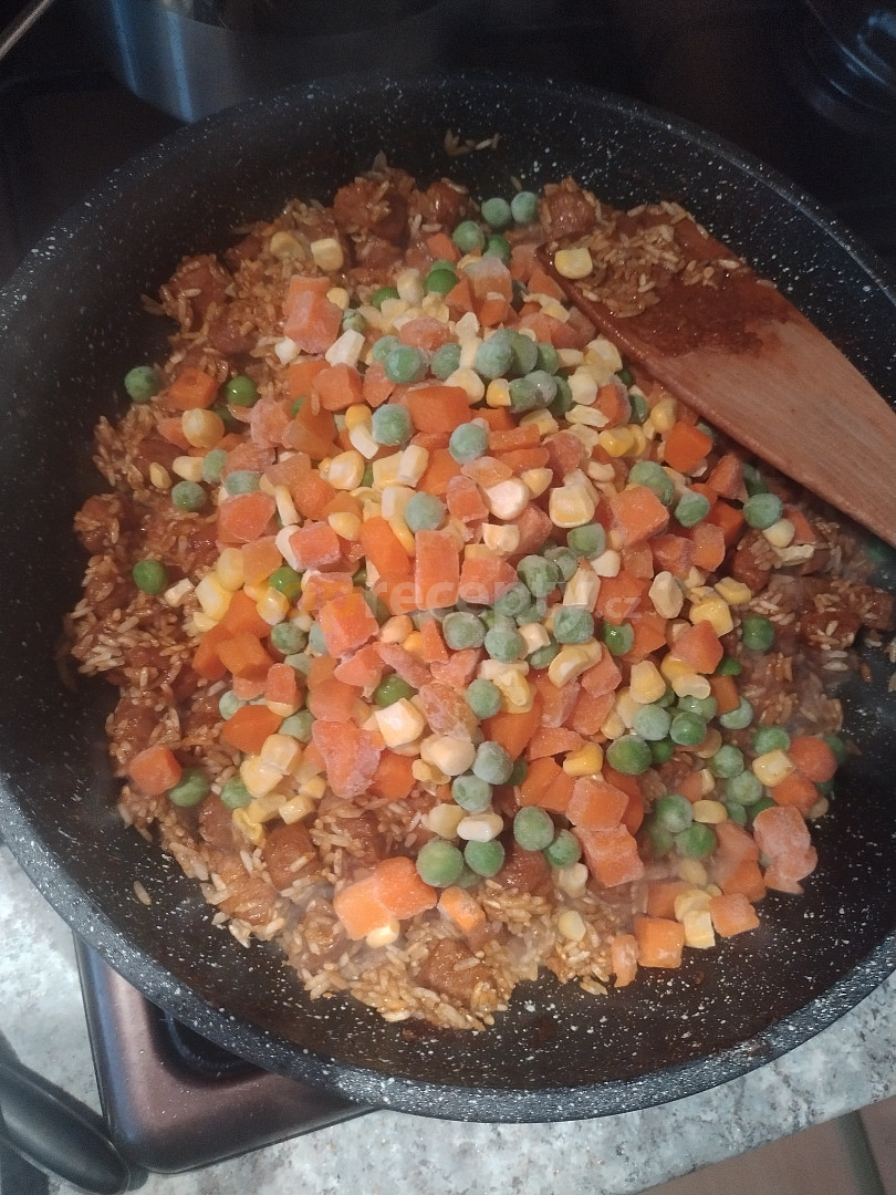 plec vepřová, rýže, směs zeleninová mražená, cibule, česnek, sůl, pepř mletý, paprika sušená sladká, olej, voda, sýr tvrdý