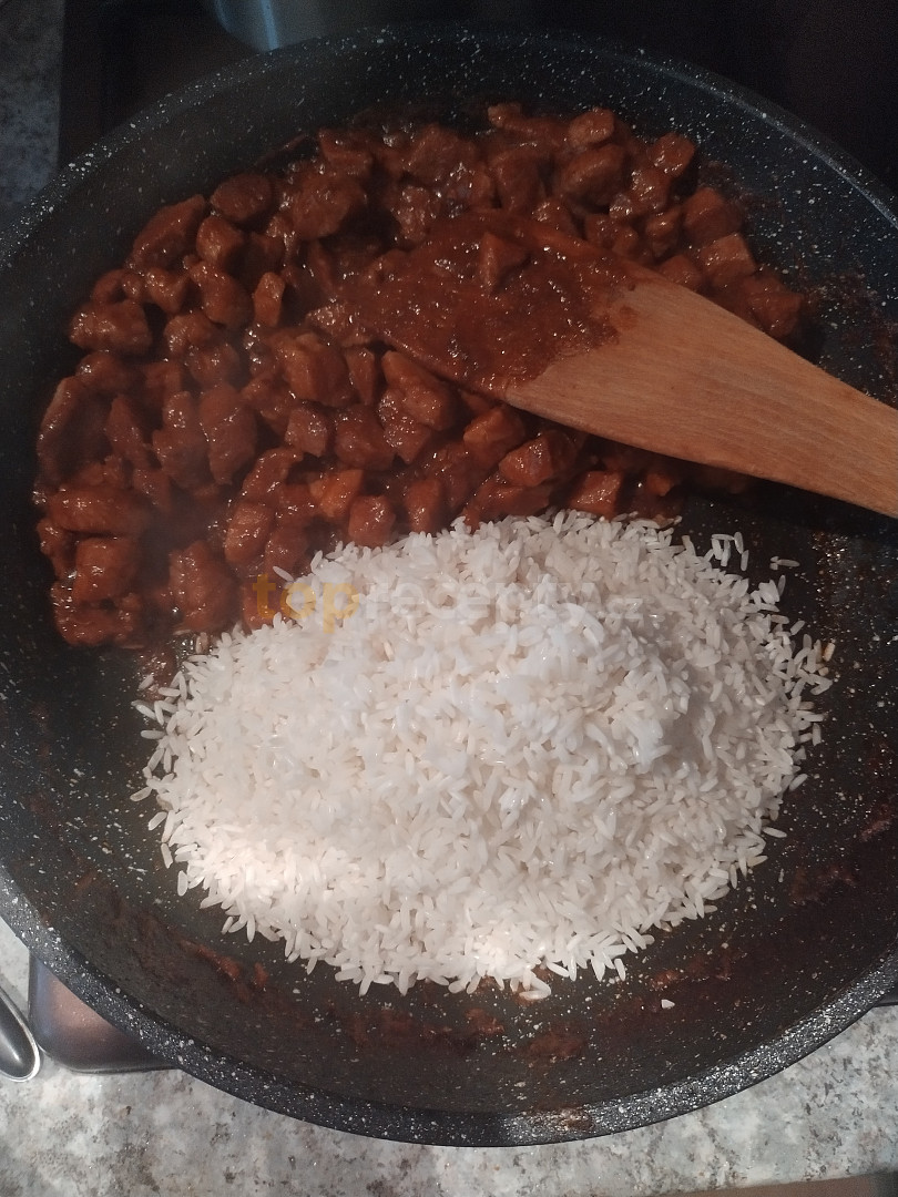 plec vepřová, rýže, směs zeleninová mražená, cibule, česnek, sůl, pepř mletý, paprika sušená sladká, olej, voda, sýr tvrdý