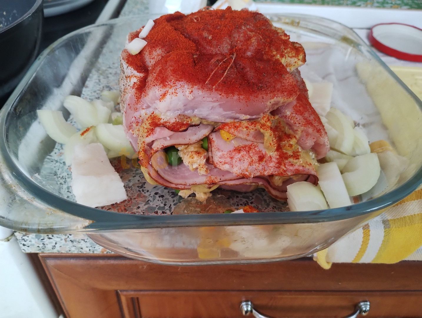 pečeně vepřová, sůl, pepř mletý, česnek, zázvor, hořčice dijonská, slanina anglická, paprikový salám, vejce, máslo, hrášek mražený, sádlo, cibule, česnek, máslo, vývar masový