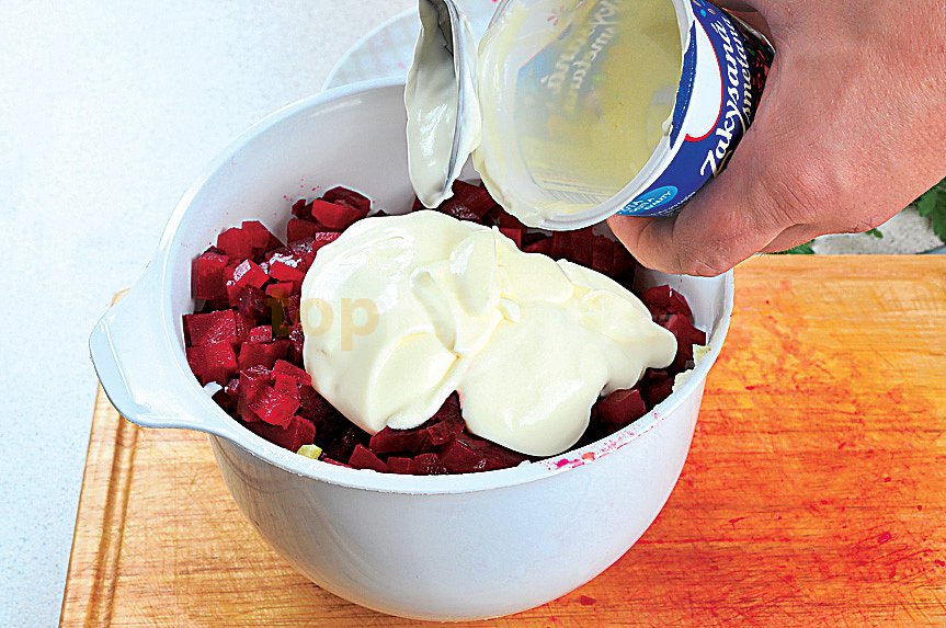 řepa červená, smetana zakysaná, brambory, okurky sterilované, cibule, olej, cukr krupice, ocet, petržel, sůl, pepř mletý