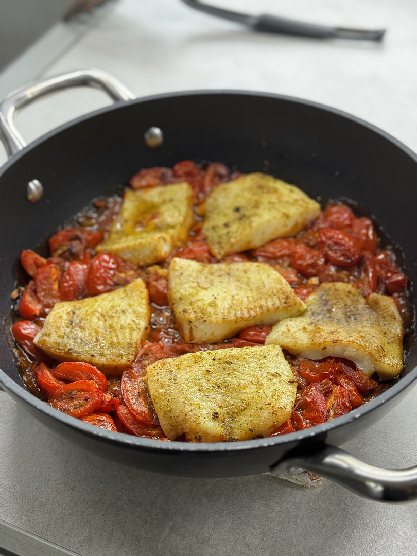 okoun nilský, rajče cherry, paprika sušená sladká, olivy černé, olej olivový extra virgin, rajče sušené v oleji, kapary, ořechy piniové, česnek, víno bílé, petrželka, koření oregáno, chilli paprika čerstvá, sůl, pepř mletý, koření na ryby
