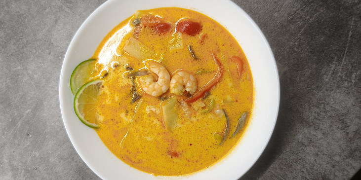 rýže, máslo, olej, krevety, česnek, cibule, paprika čerstvá červená, zázvor čerstvý, pasta kari červená, mléko kokosové, vývar zeleninový, limetka, sůl, pepř mletý, koriandr