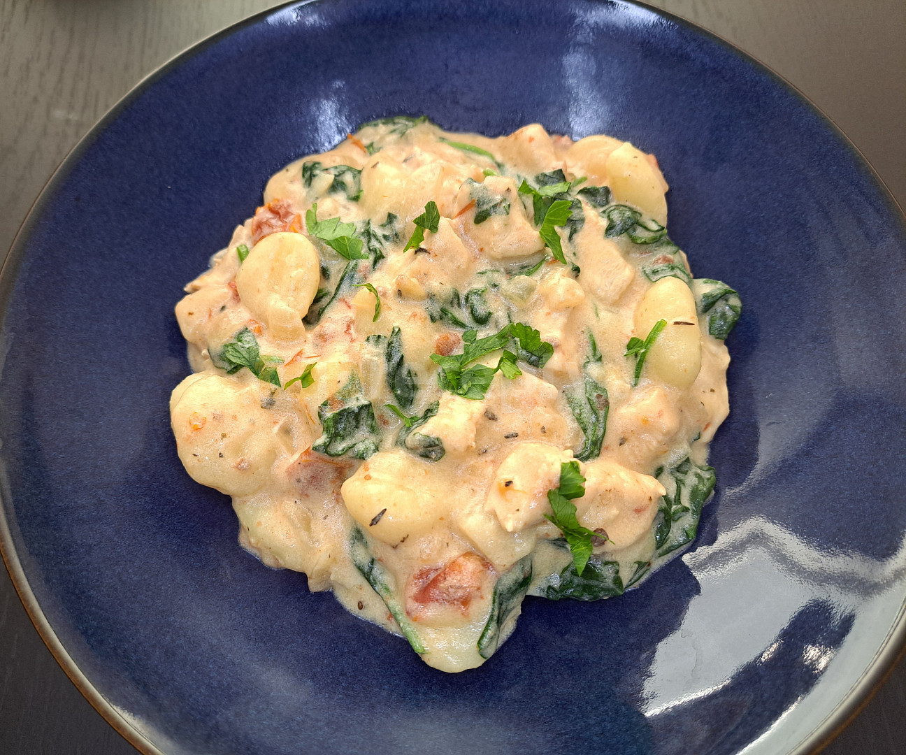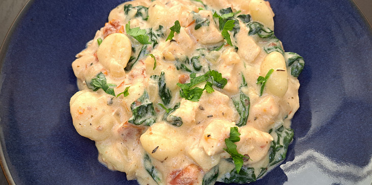 prsa kuřecí, cibule, rajče sušené, vývar masový, gnocchi, smetana ke šlehání, špenát baby, olej olivový, česnek sušený, tymián sušený, sušená bazalka, pepř mletý, sůl, petrželka