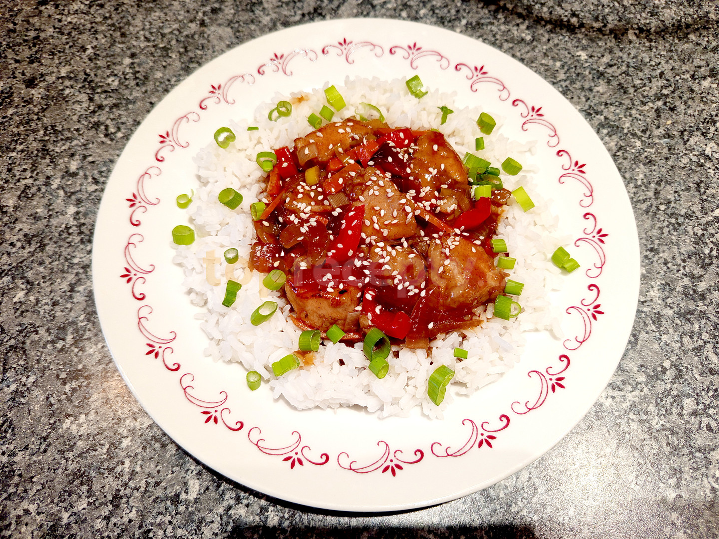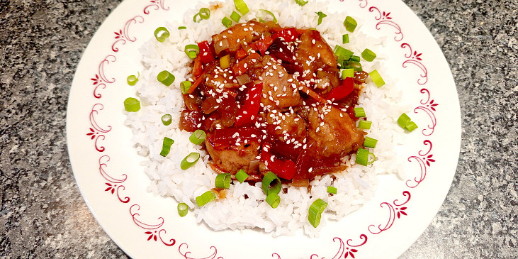 prsa kuřecí, pórek, mrkev, paprika čerstvá červená, žampióny, omáčka chilli sladká, kečup sladký, omáčka sojová, ocet rýžový, škrob, koriandr, sůl, olej