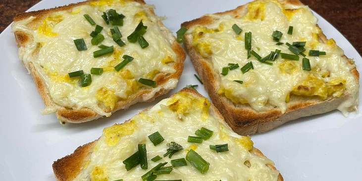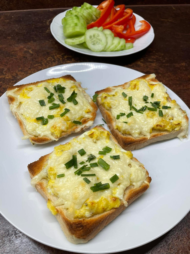 chléb toustový, vejce, cibulka jarní, máslo, sýr eidam, sůl, pepř bílý, paprika sušená sladká, pažitka