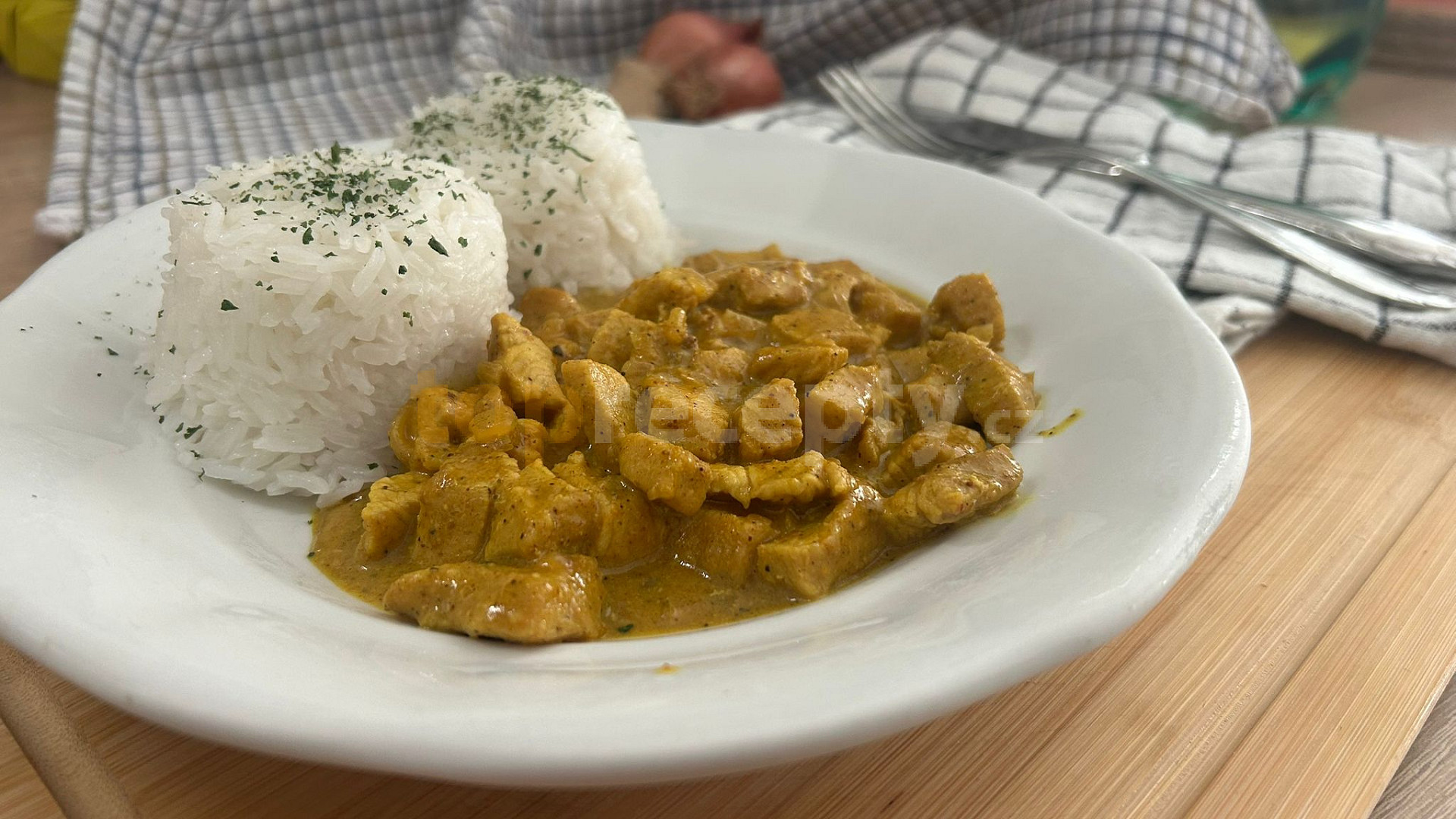 prsa kuřecí, cibule, smetana ke šlehání, rýže, voda, sůl, pepř mletý, koření kari