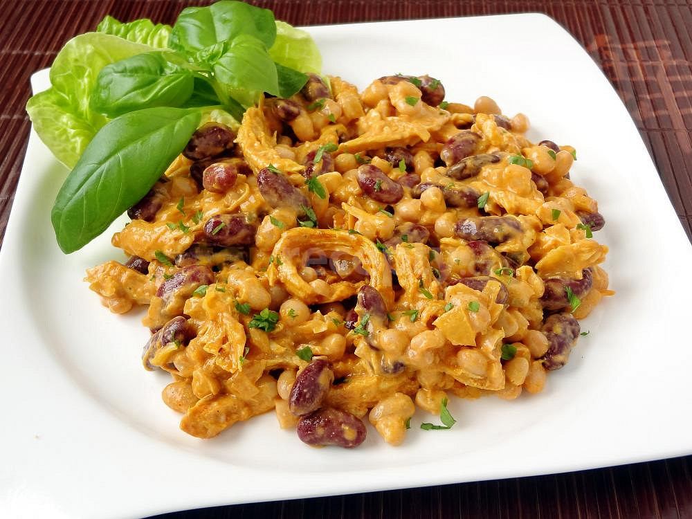 prsa kuřecí, cibule, protlak rajčatový, fazole sterilované, fazole červené sterilované, smetana zakysaná, jogurt bílý, majonéza, olej, cukr krystal, šťáva citronová, sůl, pepř mletý, koření kari, petrželka