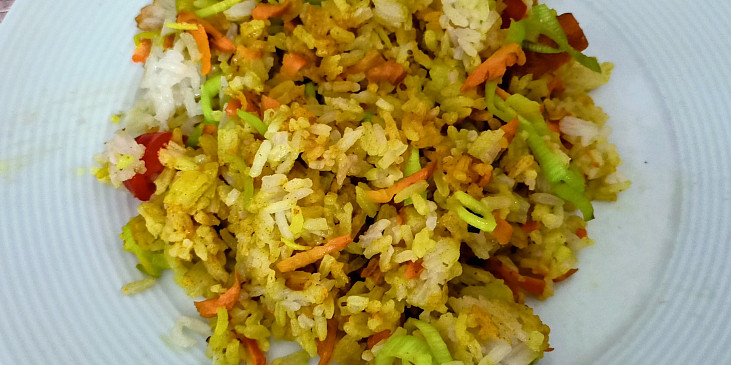 rýže, špek, rajče cherry, mrkev, cibule, pórek, česnek, olej, koření kari, sůl, pepř mletý