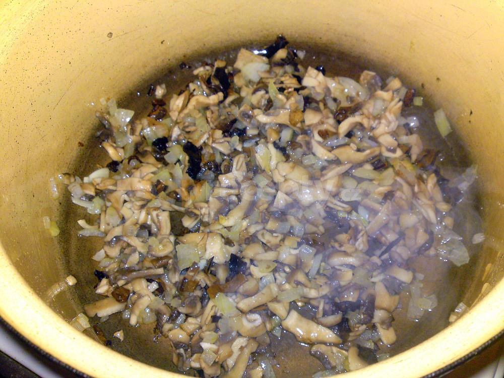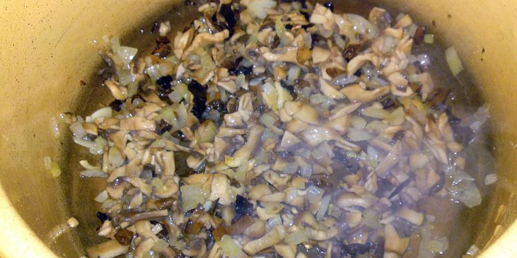 stehno kuřecí uzené, rýže dlouhozrnná, cibule, žampióny, houby sušené, česnek, sádlo, sůl, pepř mletý, kmín mletý, majoránka