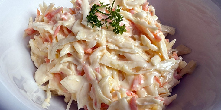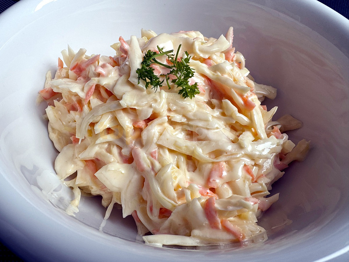 zelí hlávkové, mrkev, cibule, olej olivový, majonéza, jogurt bílý, šťáva citronová, hořčice, cukr, sůl, pepř bílý mletý