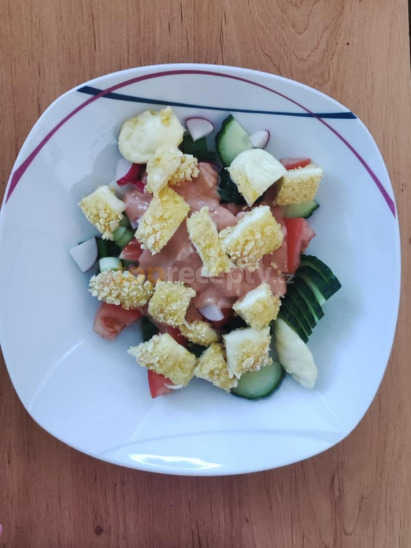 sýr, mouka hladká, vejce, strouhanka kukuřičná, sůl, pepř mletý, olej, okurka salátová, rajče, ředkvičky, cibule, tatarská omáčka, kečup sladký, česnek, chilli