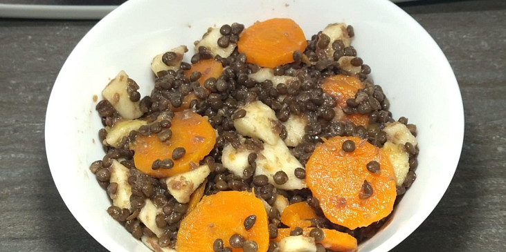 čočka beluga, bobkový list, mrkev, jablko, sůl, voda, med, šťáva citronová, olej, hořčice dijonská, pepř mletý, sůl