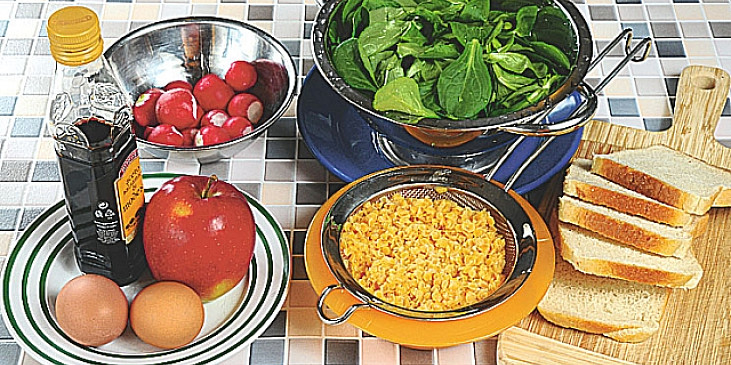 čočka červená, polníček, ředkvičky, jablko, máslo, chléb toustový, vejce, ocet balsamiko, olej slunečnicový, bazalka čerstvá, sůl, pepř mletý, semínka sezamová