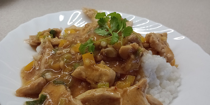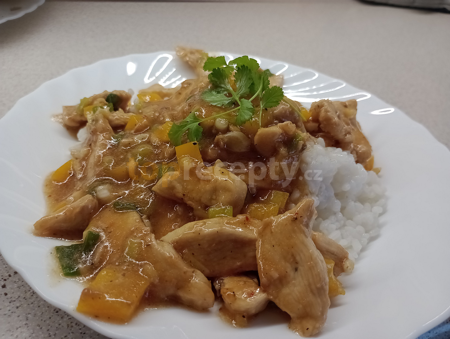 prsa kuřecí, škrob kukuřičný, olej, česnek, zázvor, chilli paprika čerstvá, omáčka rybí, omáčka sojová, ústřicová omáčka, ocet rýžový, cibulka jarní, pepř sečuánský, voda, cibulka, koriandr čerstvý