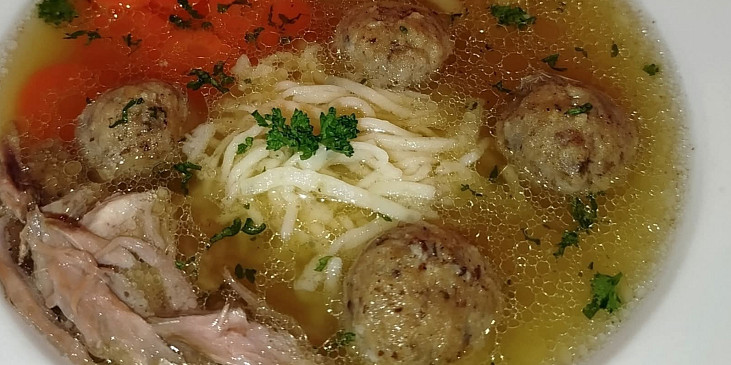 skelet kuřecí, zelenina kořenová, cibule, pórek, česnek, játra kuřecí, vejce, mouka hladká, strouhanka, libeček, sůl, pepř mletý, petržel, majoránka, koření divoké