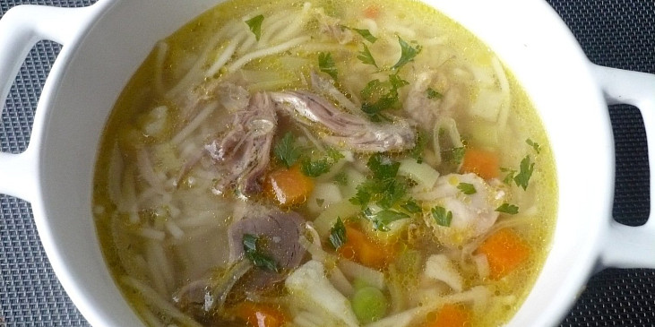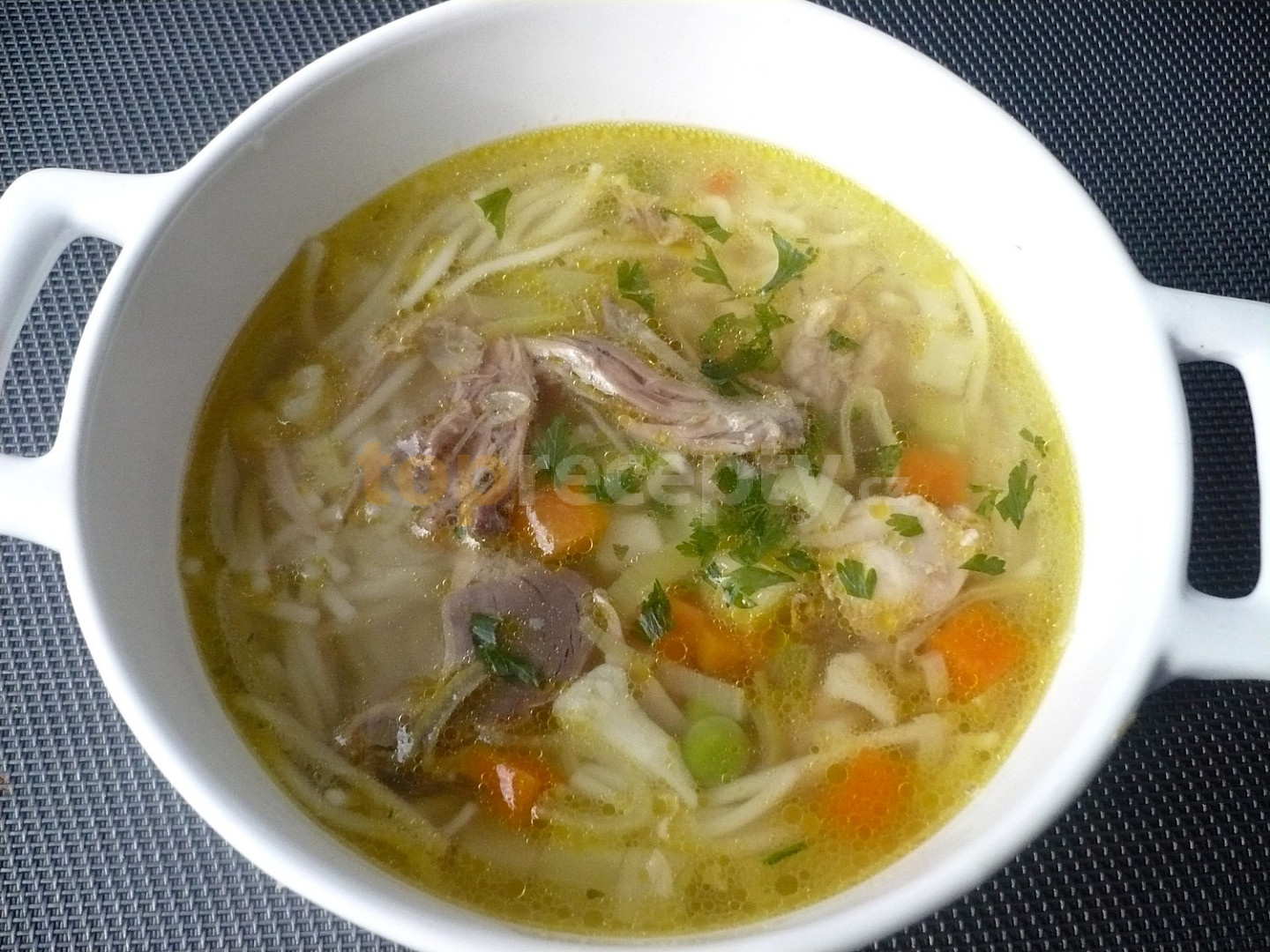 slepice, cibule, kurkuma, pepř celý, pepř čtyř barev, mrkev, celer, hrášek, petržel, libeček, petrželka, nudle polévkové