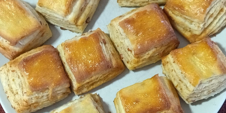 mouka polohrubá, škvarky, droždí, cukr moučkový, sůl, pepř mletý, vejce, žloutek, mléko, olej, vejce, kmín celý
