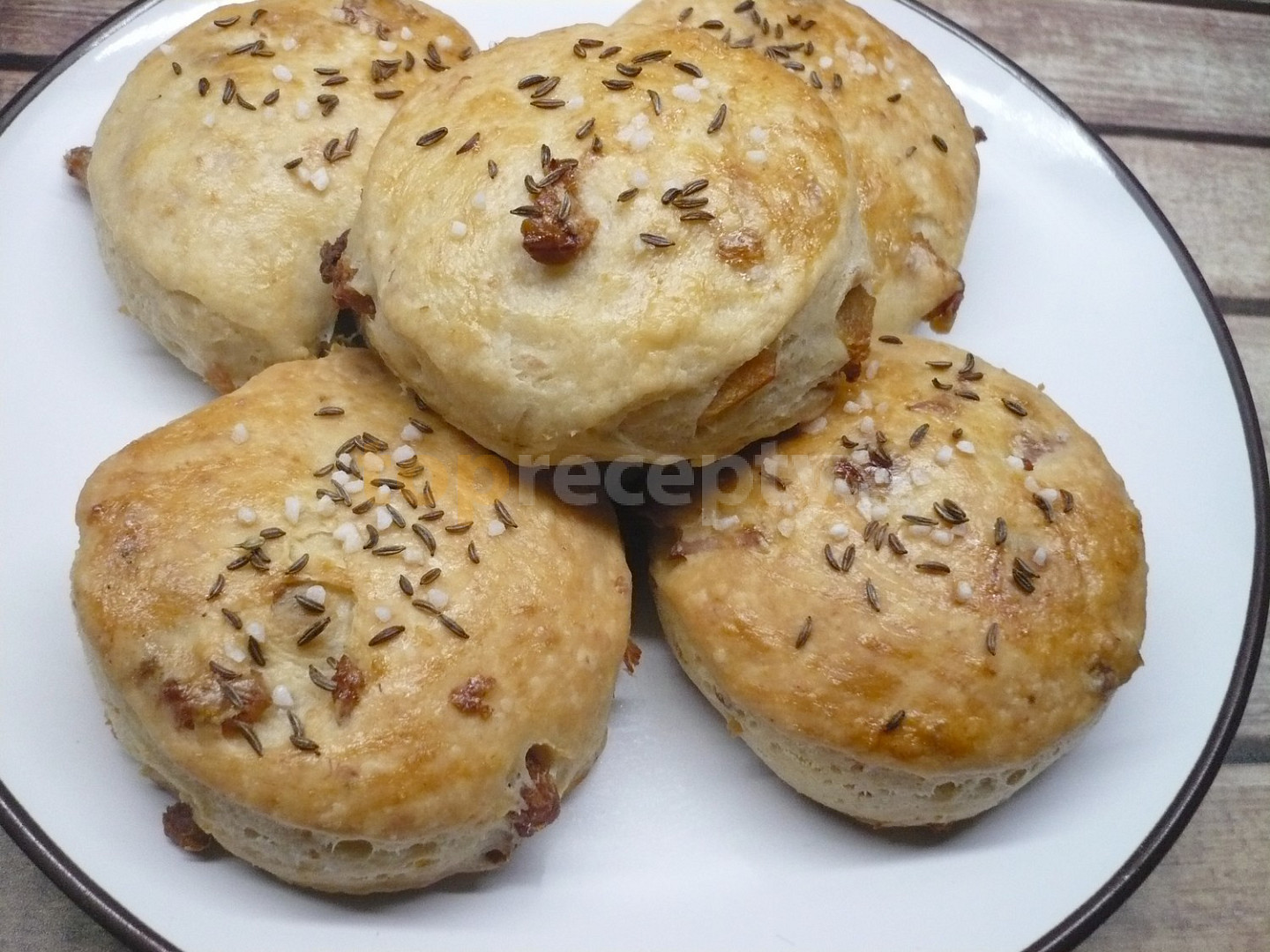 mouka hladká, sůl, cukr krupice, droždí čerstvé, žloutek, škvarky, sádlo, mléko, bílek, sůl hrubá, kmín drcený, paprika sušená sladká, pepř mletý, sádlo