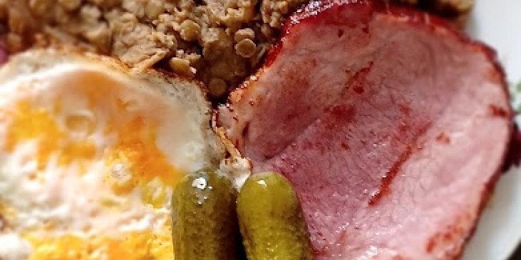 čočka, bobkový list, koření nové koření, pepř, sůl, cibule, olej, mouka hladká, cukr krystal, ocet, sůl, okurky sterilované, lák okurkový, cibule, mouka hladká, olej, vejce, maso uzené
