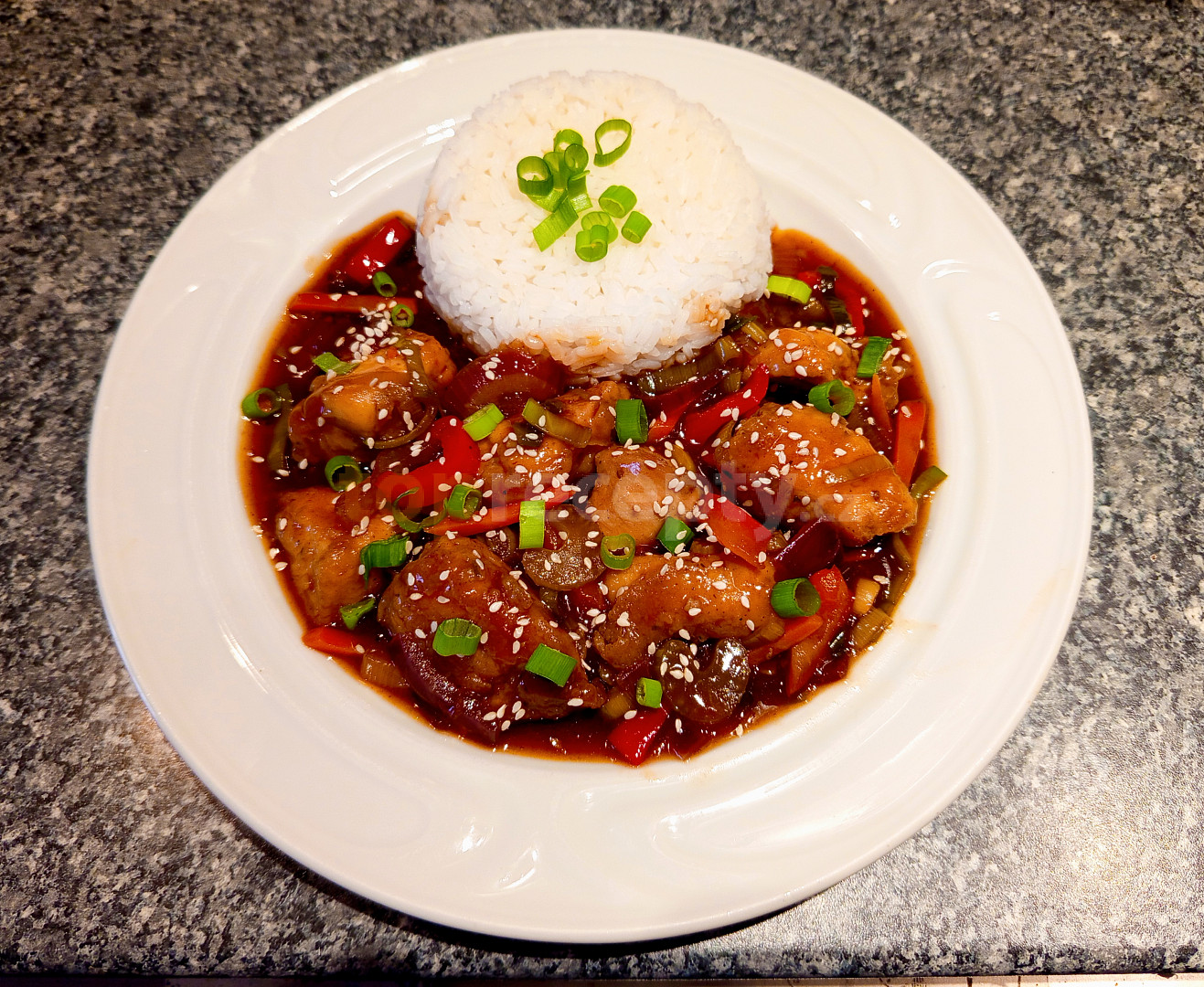 prsa kuřecí, koření kari, omáčka sojová, vejce, solamyl, olej, sůl, pepř mletý, cibule červená, paprika čerstvá červená, mrkev, pórek, celer řapíkatý, olej, omáčka sojová, med, ocet rýžový, protlak rajčatový, kečup sladký, voda, solamyl, semínka sezamová, cibulka jarní, rýže