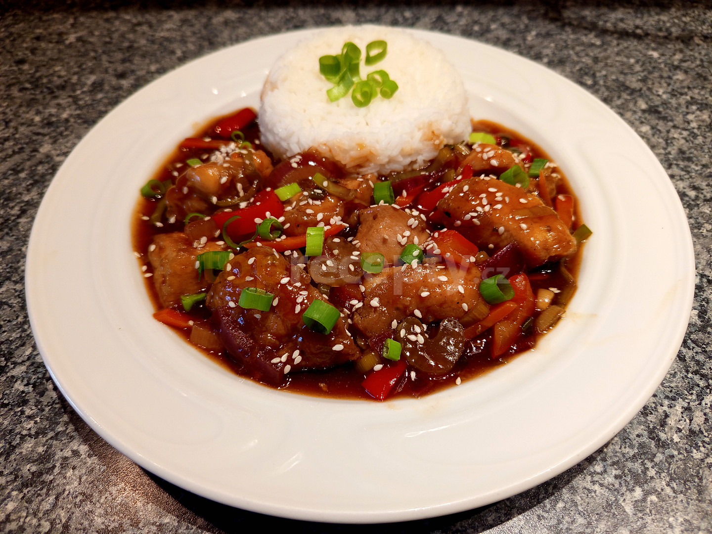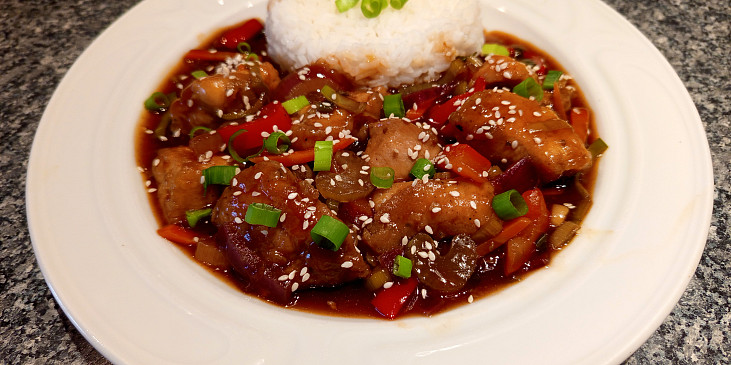 prsa kuřecí, koření kari, omáčka sojová, vejce, solamyl, olej, sůl, pepř mletý, cibule červená, paprika čerstvá červená, mrkev, pórek, celer řapíkatý, olej, omáčka sojová, med, ocet rýžový, protlak rajčatový, kečup sladký, voda, solamyl, semínka sezamová, cibulka jarní, rýže
