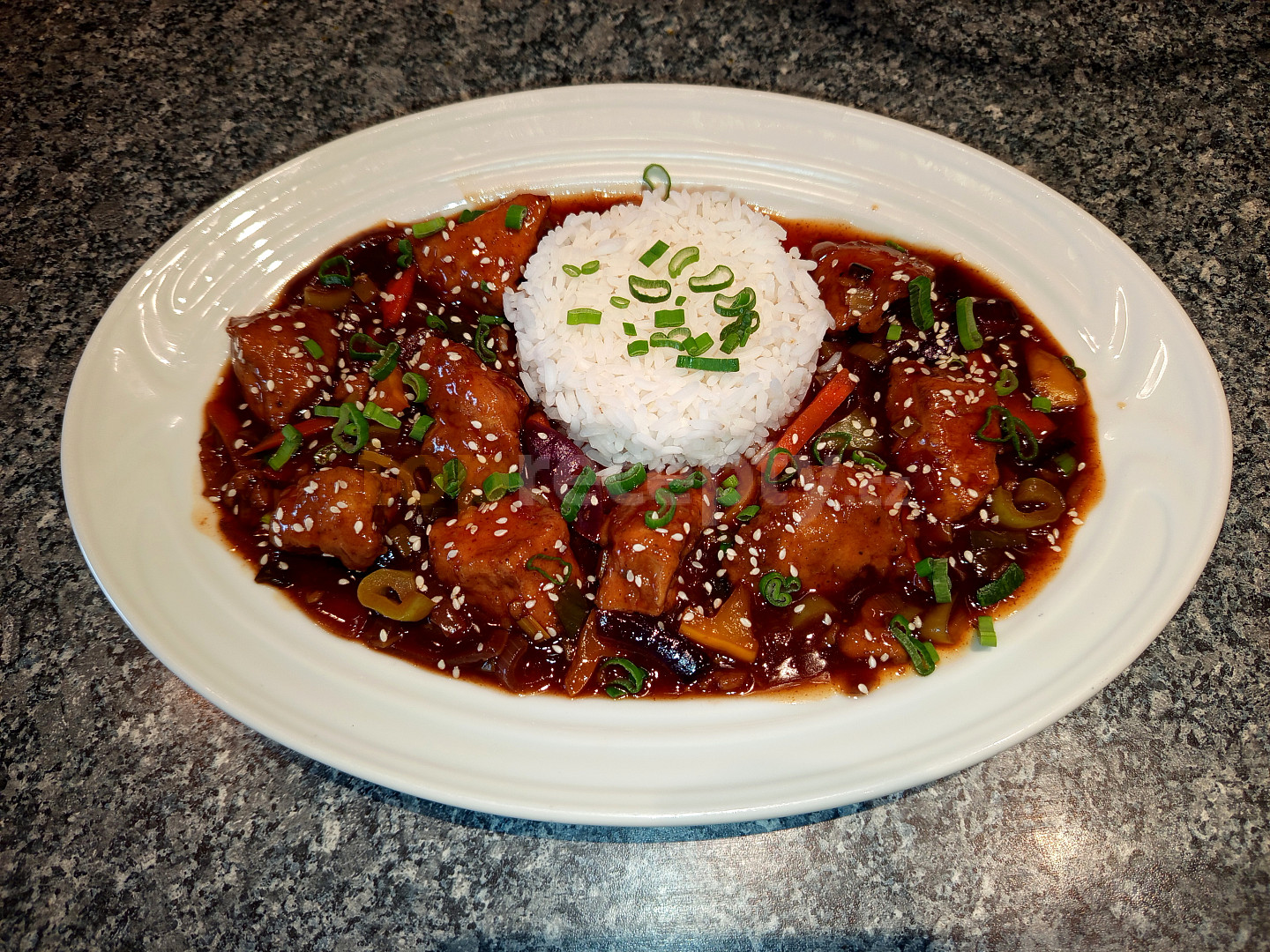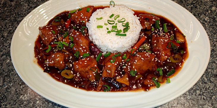 prsa kuřecí, koření kari, omáčka sojová, vejce, solamyl, olej, sůl, pepř mletý, cibule červená, paprika čerstvá červená, mrkev, pórek, celer řapíkatý, olej, omáčka sojová, med, ocet rýžový, protlak rajčatový, kečup sladký, voda, solamyl, semínka sezamová, cibulka jarní, rýže