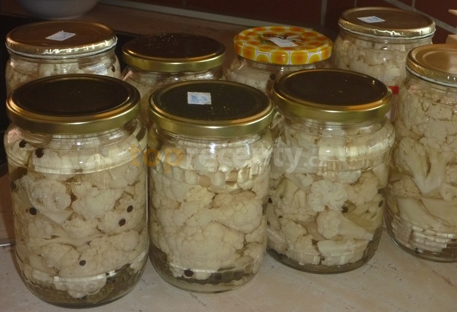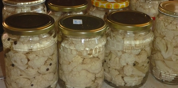 květák, voda, ocet, sůl, cukr, semínka hořčičná, pepř celý, koření nové koření, koření hřebíček, deko, chilli paprika čerstvá