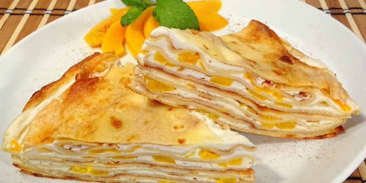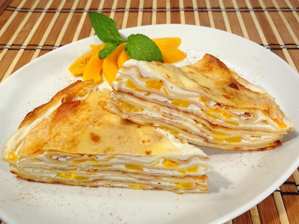 mouka hladká, mléko, vejce, sůl, tvaroh měkký, mléko, cukr krystal, cukr vanilkový, pudink vanilkový, kompot broskvový, marmeláda rybízová, máslo, olej, kompot broskvový, máta čerstvá