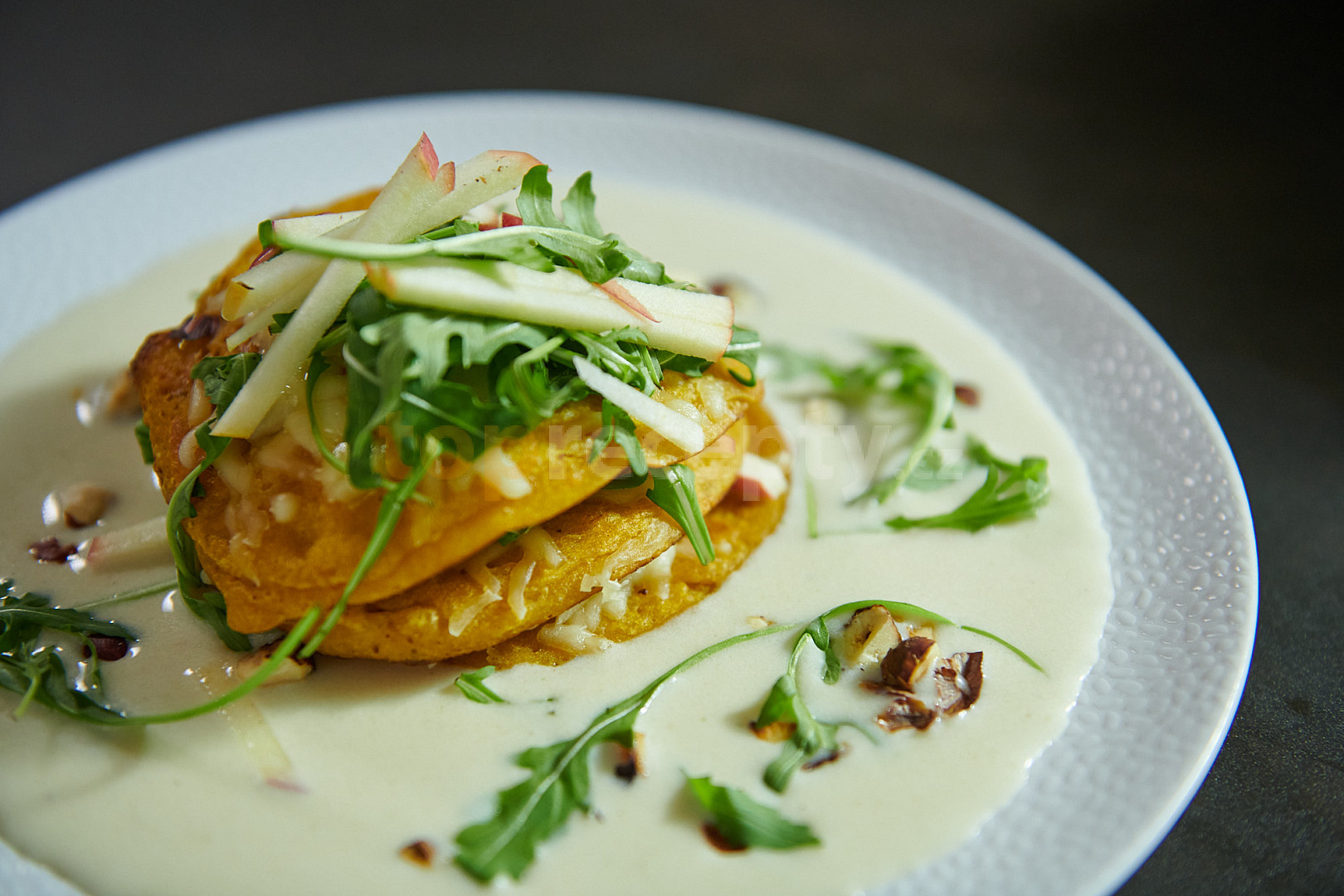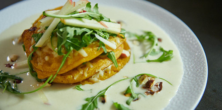 dýně hokkaido, česnek, olej olivový, tymián čerstvý, ocet jablečný, sůl, pepř mletý, pyré dýňové, podmáslí, mouka pohanková, mléko, vejce, kypřící prášek do pečiva, ghee, cukr krupice, sůl, vývar zeleninový, podmáslí, brambory, máslo, parmazán, ořech muškátový, tymián čerstvý, cibule, sůl, pepř mletý, sýr ementál, jablko, ořechy lískové, rukola