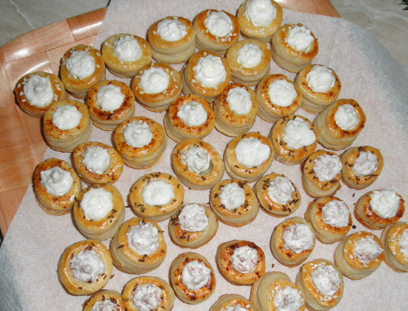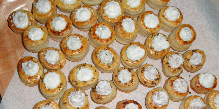 těsto listové, vejce, kmín celý, pomazánkové máslo, tvaroh měkký, sýr tavený, máslo, pepř mletý, sůl, strouhaná niva, tuňák, salám tvrdý