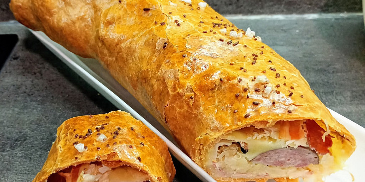 těsto listové, cibule, zelí kysané, slanina, klobása, sýr uzený, cukr krystal, olej, vejce, mléko, sůl hrubozrnná, kmín celý
