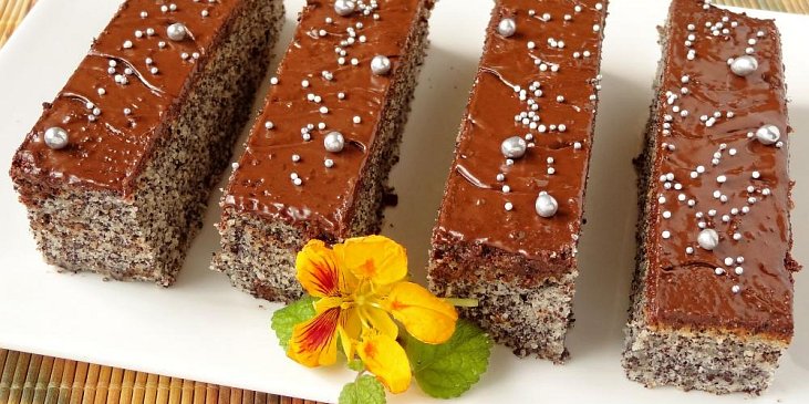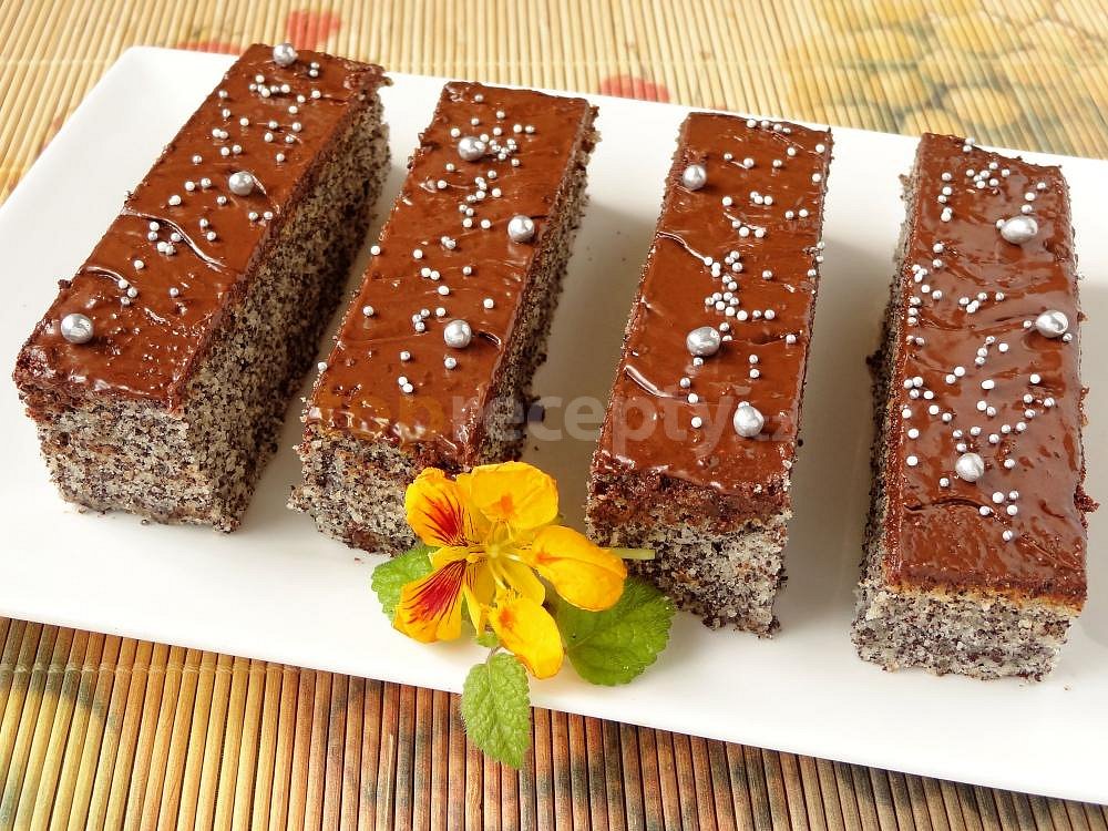 vejce, cukr krupice, máslo, cukr vanilkový, mák mletý, ořechy mleté, mouka hrubá, rum, voda, skořice mletá, kypřící prášek do pečiva, tuk, mouka hrubá, zavařenina rybízová, poleva čokoládová
