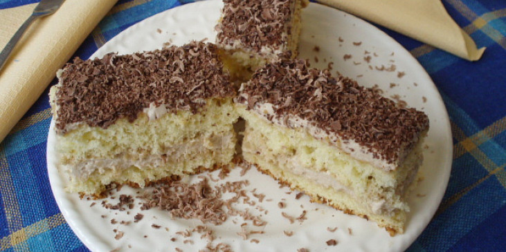 vejce, voda, cukr moučkový, cukr vanilkový, mouka hladká, solamyl, kypřící prášek do pečiva, smetana ke šlehání, ztužovač šlehačky, cukr moučkový, cukr vanilkový, káva instantní, čokoláda