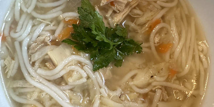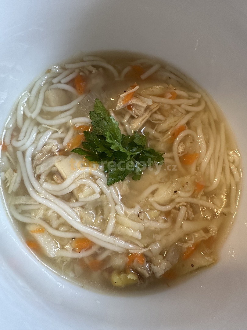 slepice, mrkev, celer, petržel, česnek, cibule, pepř celý, bobkový list, koření nové koření, sůl, chilli, nať petrželová, nudle