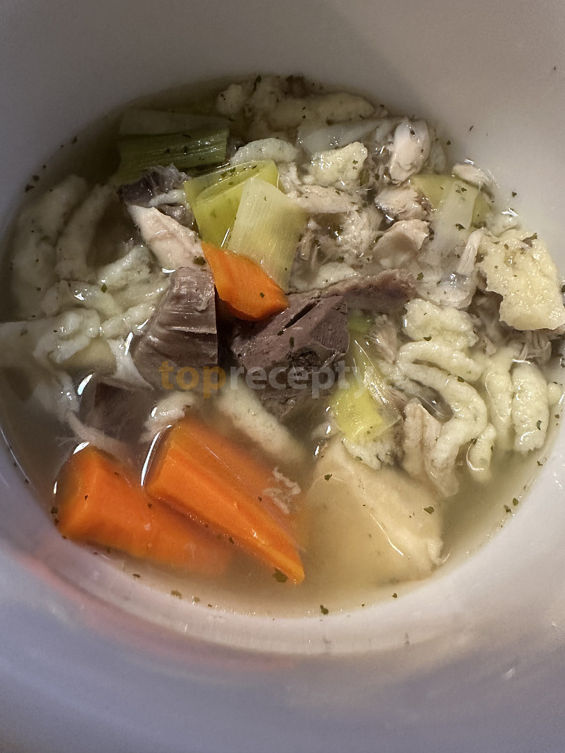 slepice, voda, sůl, koření nové koření, pepř celý, bobkový list, cibule, česnek, mrkev, petržel, celer, libeček čerstvý, polévková zelenina, petrželka, vejce, mléko, mouka polohrubá, sůl