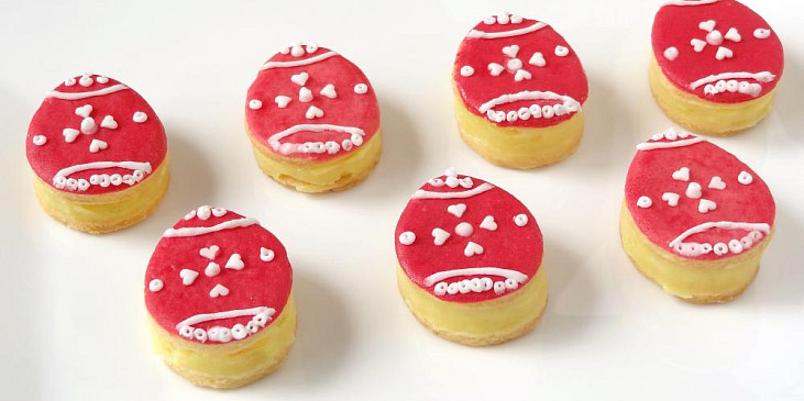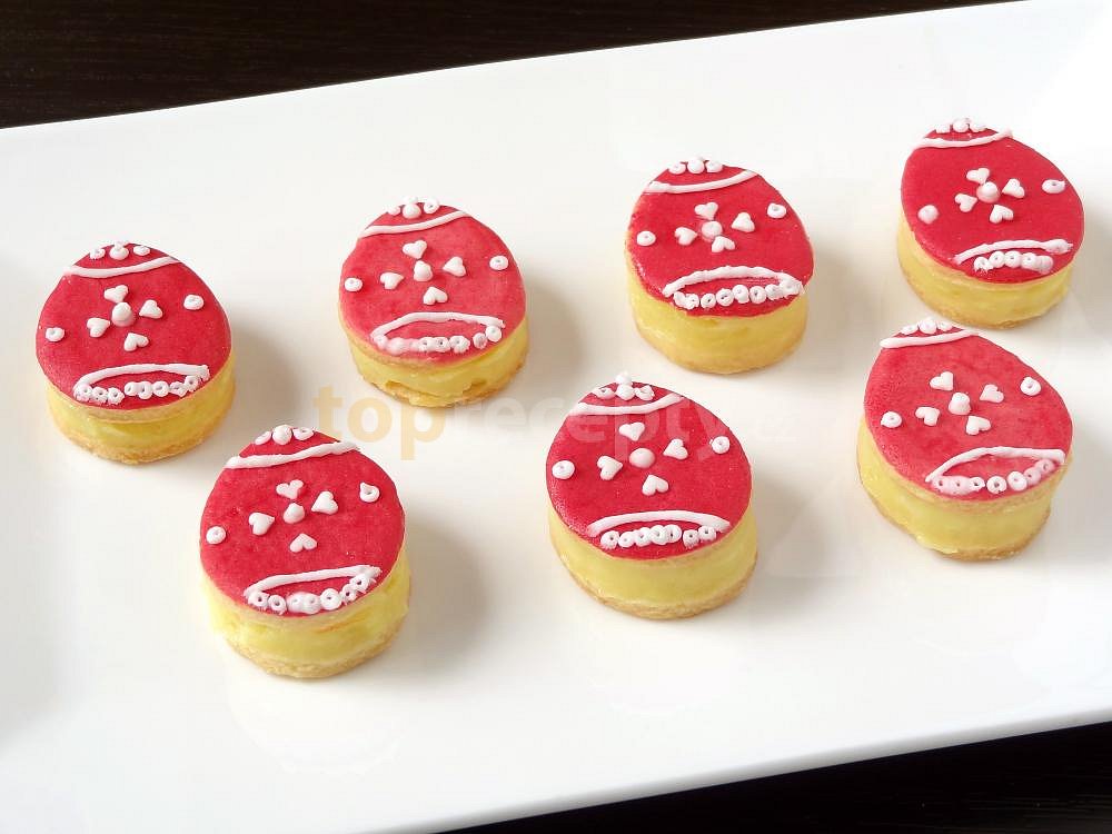 mouka hladká, žloutek, tuk hera, cukr moučkový, máslo, salko, čokoláda bílá, mandle mleté, zdobení, potravinářské barvivo