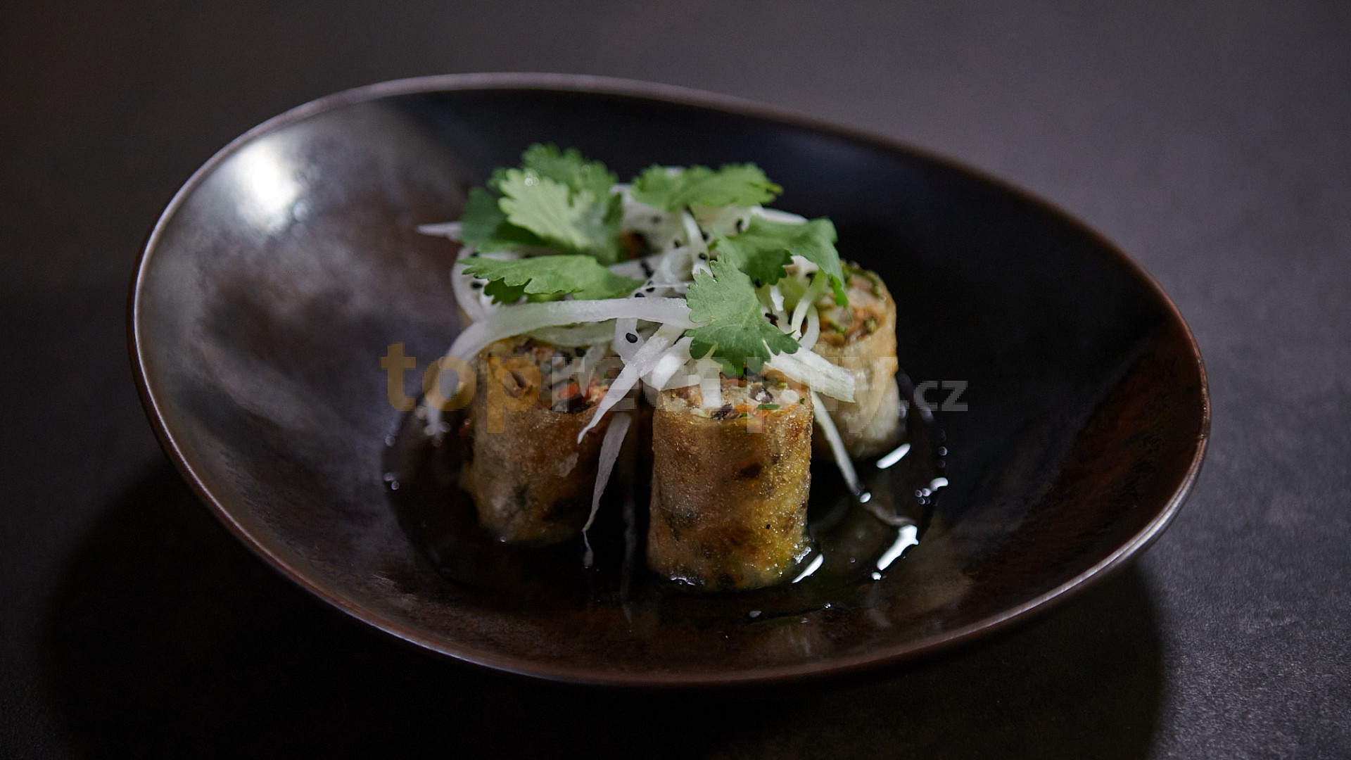 bůček, cibule šalotka, koriandr, cibulka jarní, vejce, pepř mletý, sůl, cukr hnědý, nudle skleněné, houby shiitake, jidášovo ucho, mrkev, klíčky, krevety, voda, cukr hnědý, omáčka rybí, ocet, chilli paprika čerstvá, česnek, papír rýžový, olej, ředkev, semínka sezamová