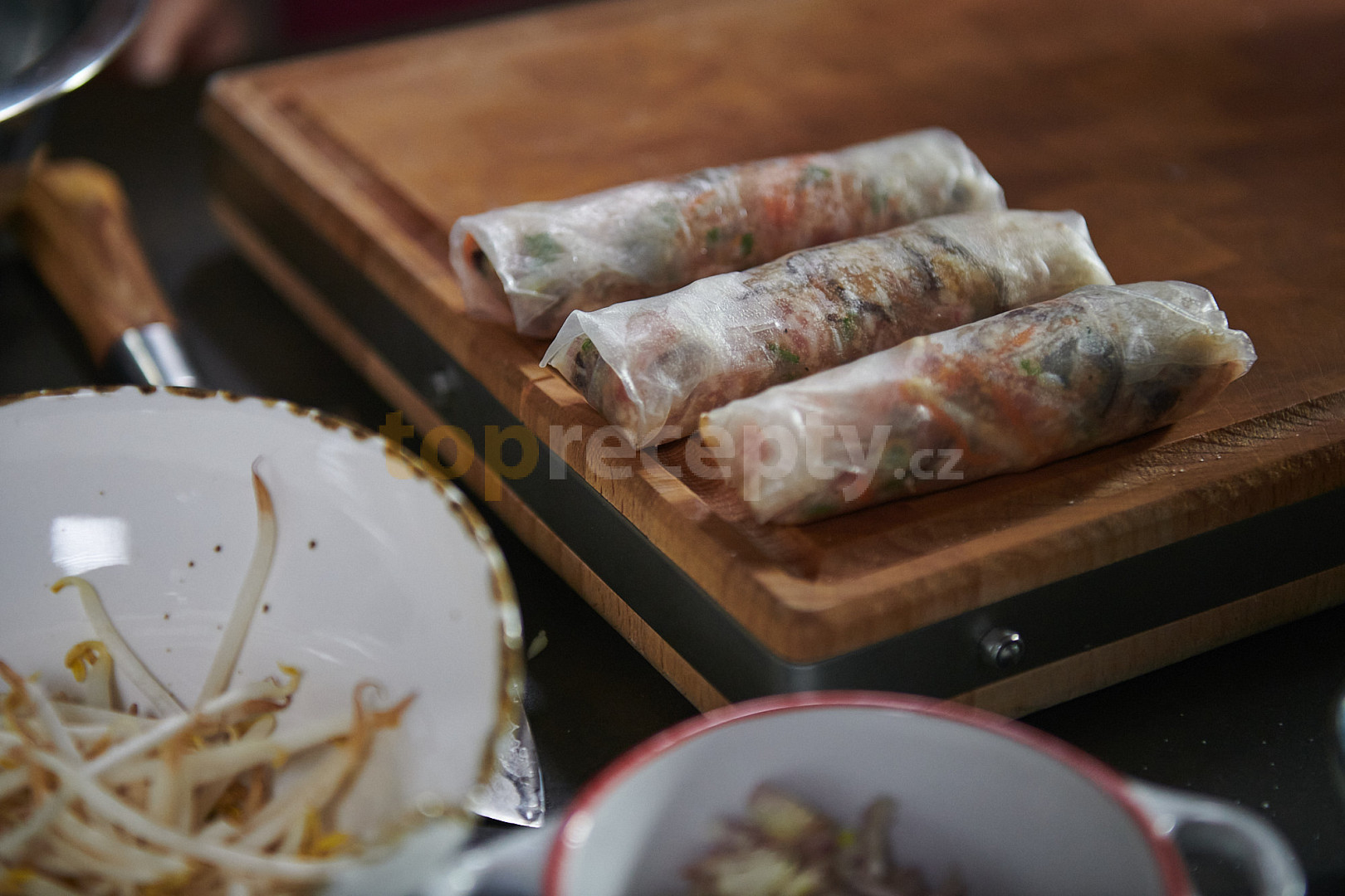 bůček, cibule šalotka, koriandr, cibulka jarní, vejce, pepř mletý, sůl, cukr hnědý, nudle skleněné, houby shiitake, jidášovo ucho, mrkev, klíčky, krevety, voda, cukr hnědý, omáčka rybí, ocet, chilli paprika čerstvá, česnek, papír rýžový, olej, ředkev, semínka sezamová